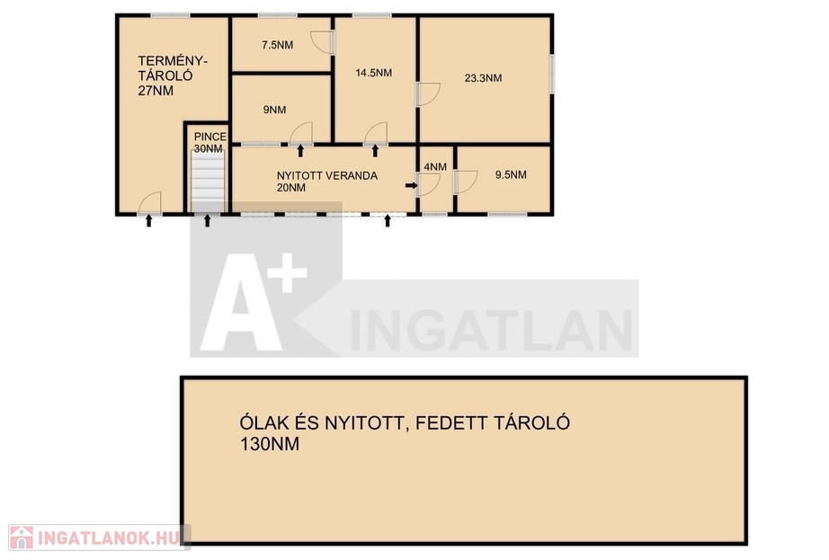 - téglából 1996-ban épített terménytároló, ami a ház toldaléka szintén alkalmas még egy szoba kialakítására, alatta 30nm-es pince található
