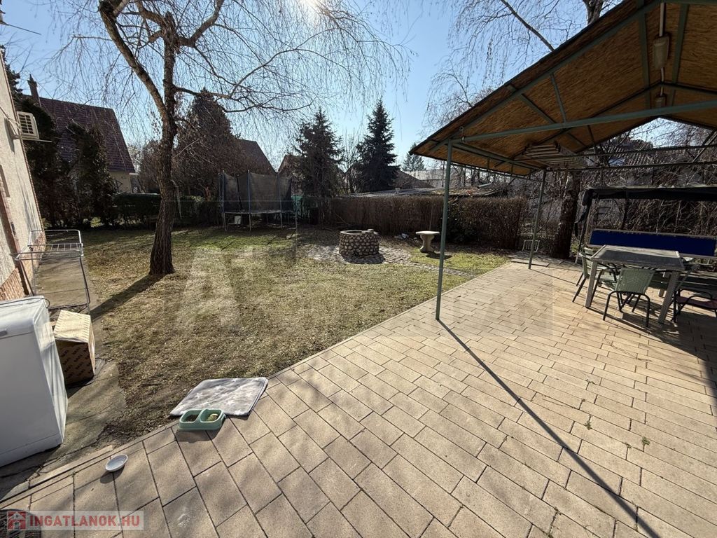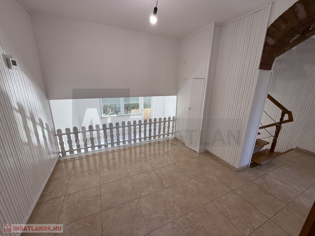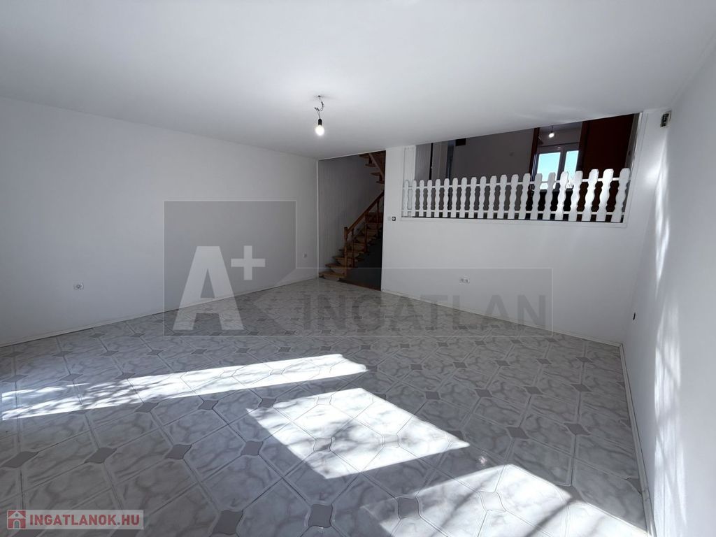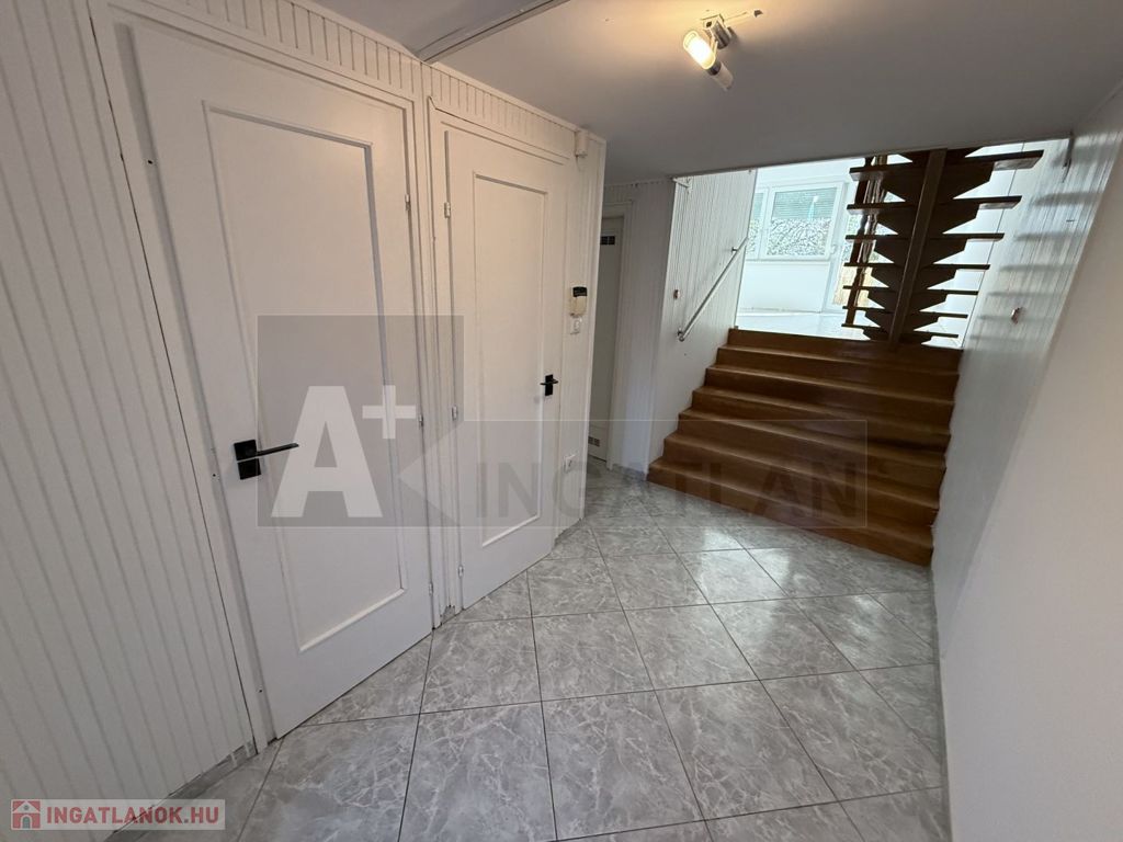 alsó szint : garázs fürdő és külön mosdó + félszint : tágas, napfényes nappali + terasz kapcsolattal és lejárattal a kertbe ,