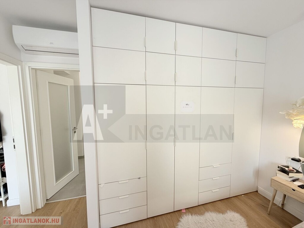 A vételár részét képezik : a gépesített konyhabútor és a méretre gyártott , 3 gardrób szekrény is , amelyek illeszkednek a lakás egységes stílusához.