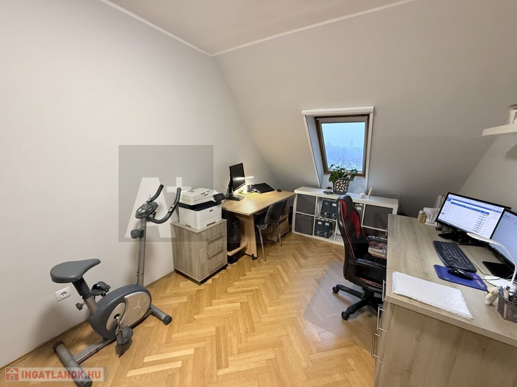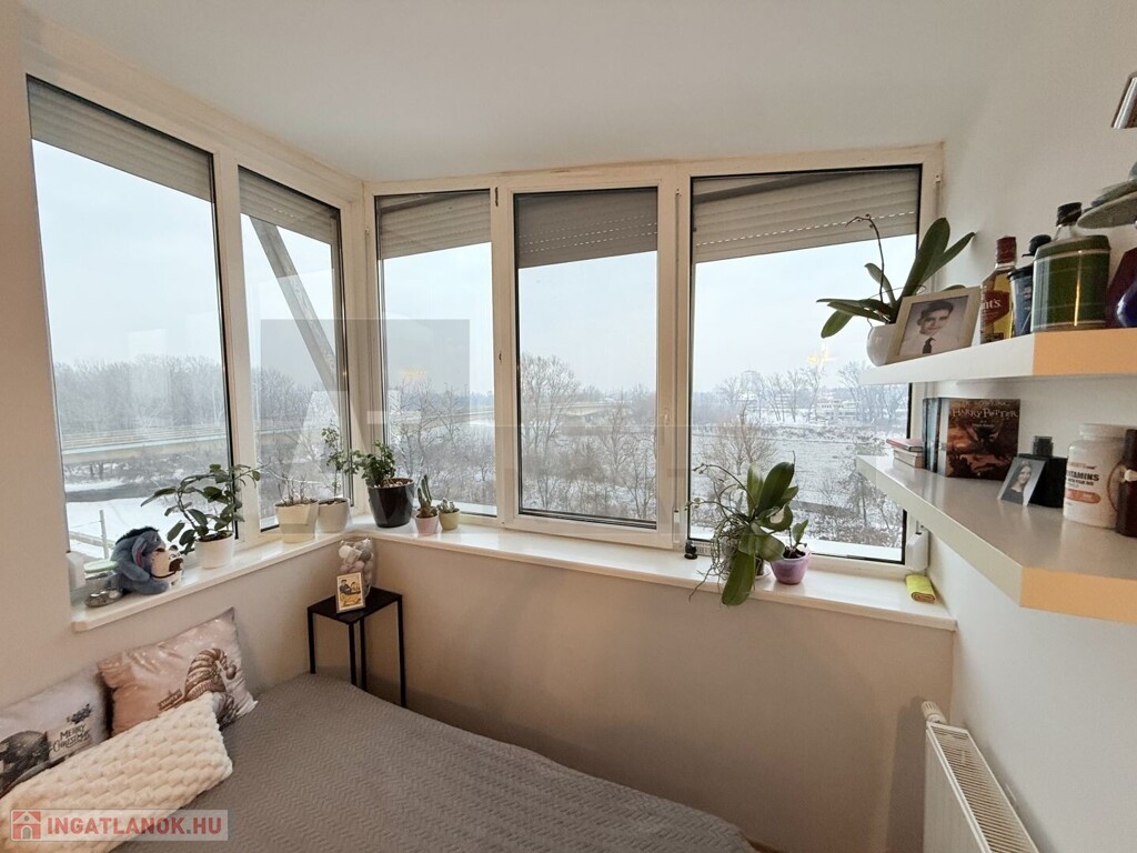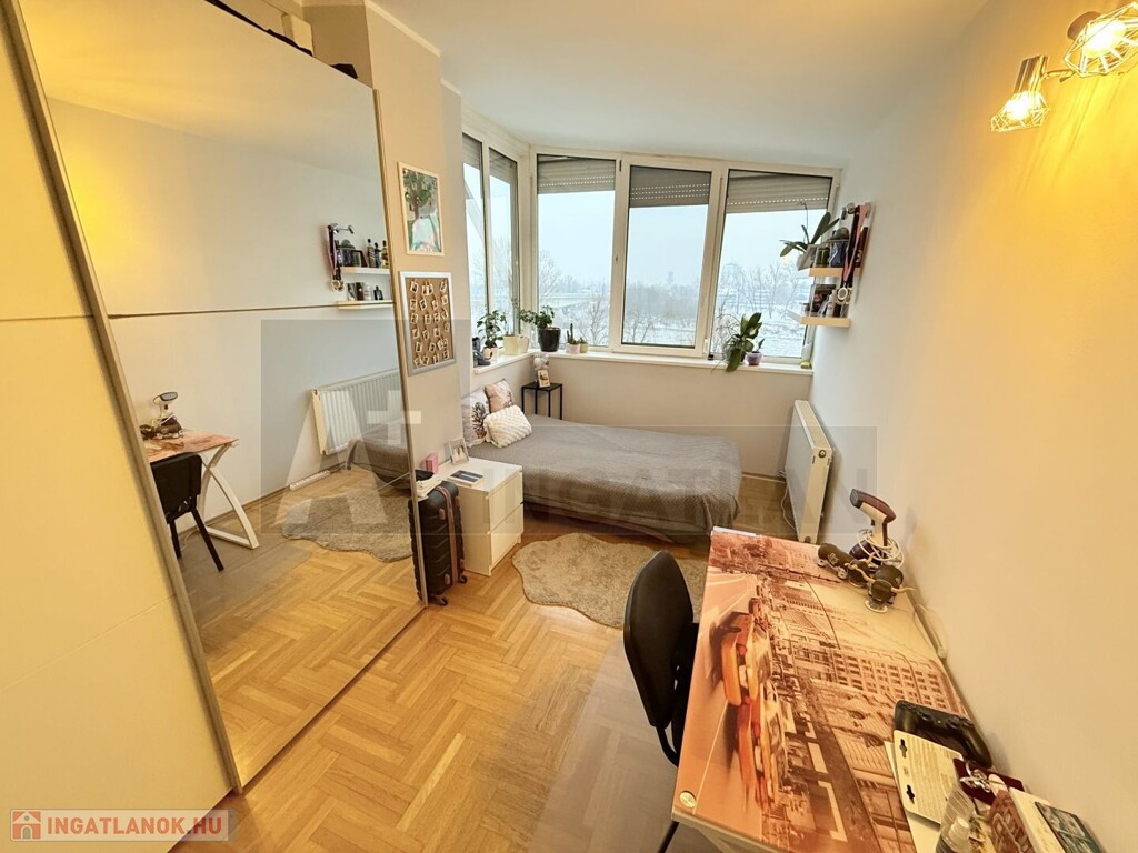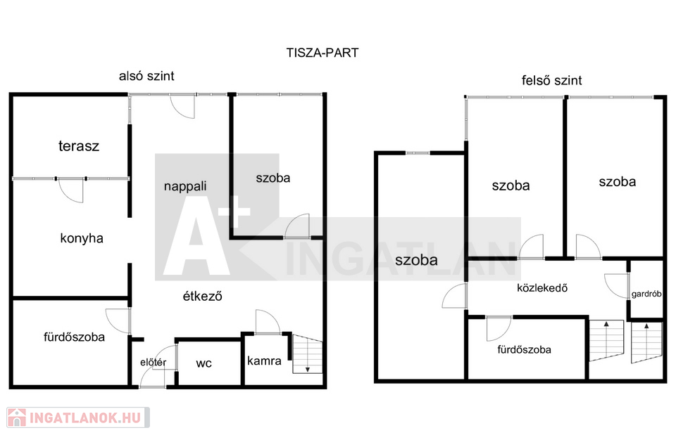 -felső szint : 3 külön nyíló , napfényes szoba , hatalmas ablakokkal , Tiszai panorámával , egy fürdőszoba , wc-vel és egy gardrób is