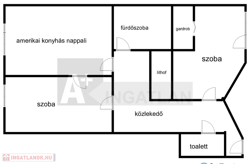 Elrendezését tekintve : napfényes , amerikai konyhás nappali , kettő külön nyíló hálószoba , az egyikhez gardrób helyiség is tartozik, fürdőszoba , toalett és egy széles közlekedő , ahol lehetőség van további gardrób szekrények kialakítására is.