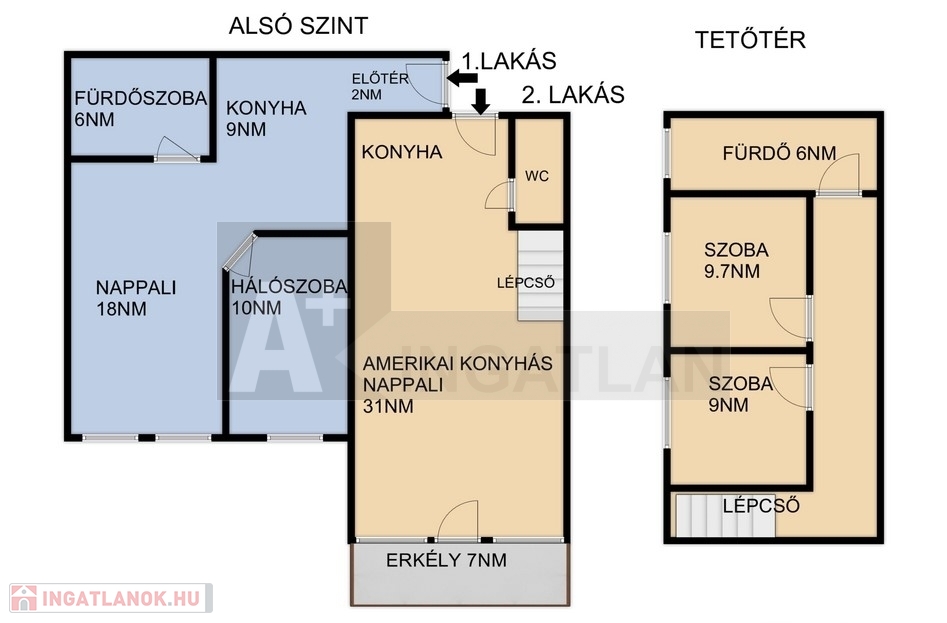 - belső kétszintes, alsó szint 33nm+7nm erkély, felső szint nettó 25nm